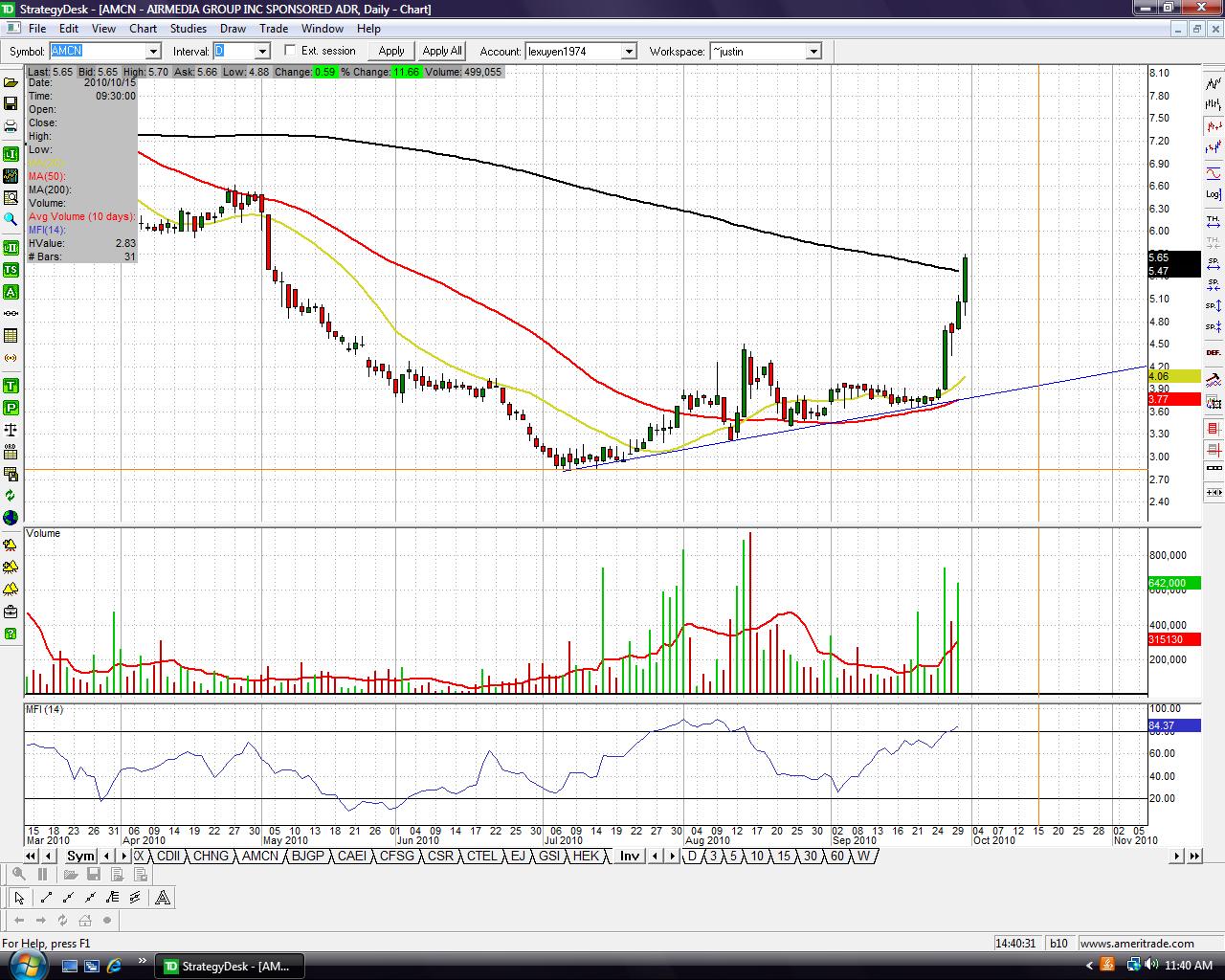 Very healthy looking stock. Rise on heavy volume and pulls back on light volume. There is resistance @ $5.80. Watch for a pull back before entering.